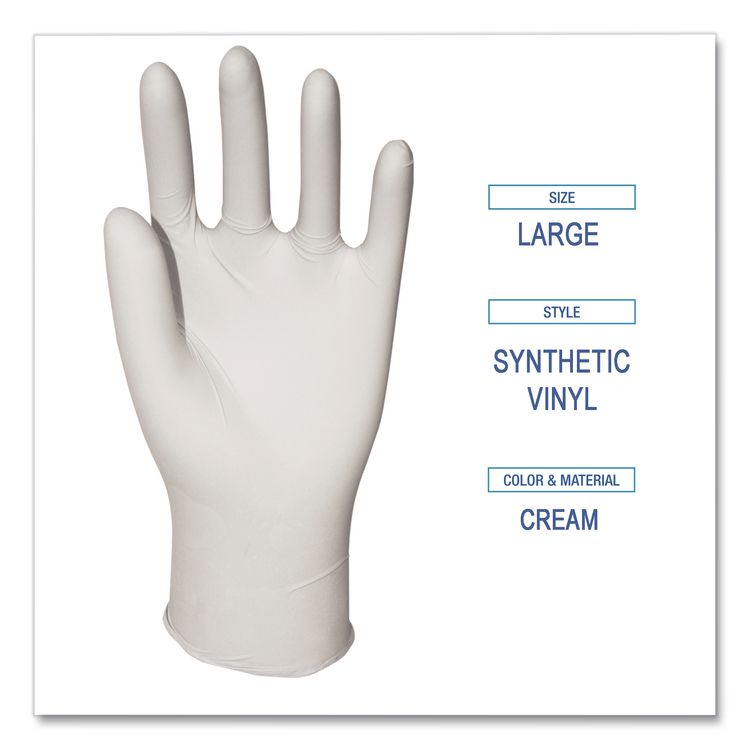 Boardwalk Powder-Free Synthetic Vinyl Gloves look and feel like latex but don’t have the allergens. They are strong and protective while still offering great sensitivity. These gloves are perfect for people who may become allergic to latex. They don’t have powder, making them safer to use and safe for food contact. They are cream in color and large. The gloves are 4 mils thick and come in a carton of 1,000.