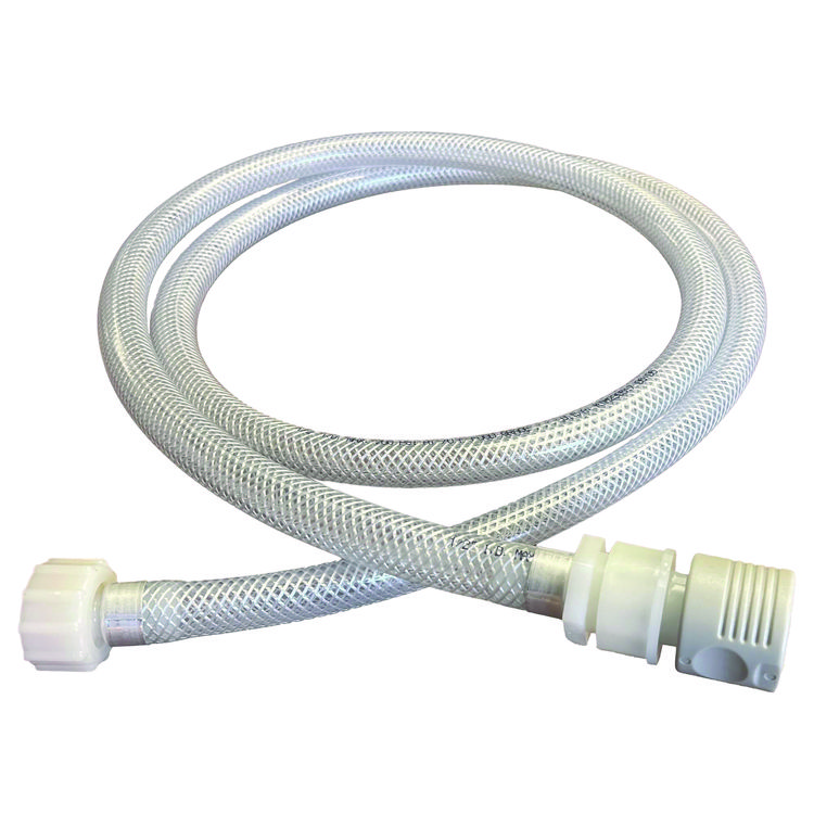 The Boardwalk PDC Hose Kit includes a 6-foot water hose with a quick-connect feature for easy use with PDC chemicals. It works with P&G models 72000, 72001, 72002, 72003, and 86678. The hose has a 0.5-inch diameter and is clear with green accents. Each carton contains 10 hose kits.
