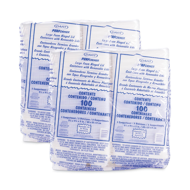Dart Foam Hinged Lid Container, 3 Compartments, 9.3 x 9.5 x 3, White, 100/Bag, 2 Bag/Carton (DCC95HTPF3R)