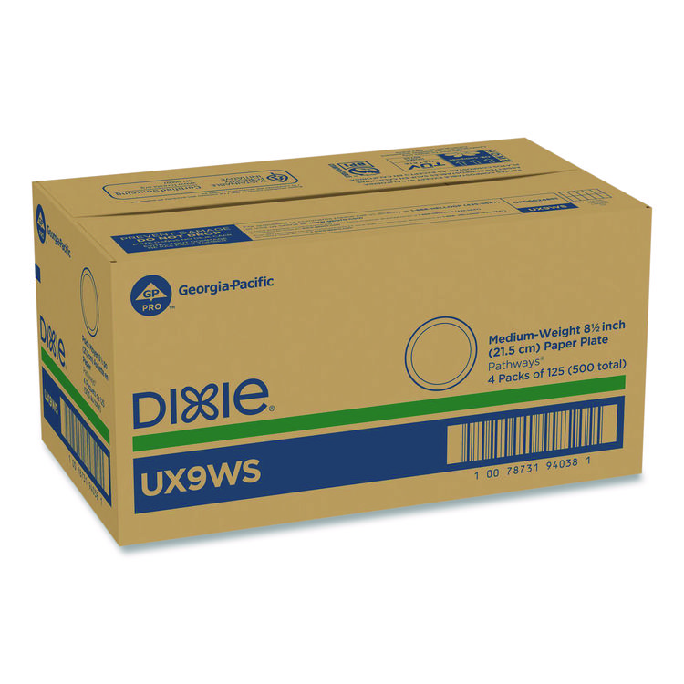 Dixie Pathways Paper Plates are strong and perfect for serving medium-weight foods. They feature a Soak-Proof Shield to resist grease and have a multi-layer design for added strength. These round plates are 8.5 inches in diameter and come in a pack of 125, with a stylish green and burgundy design.