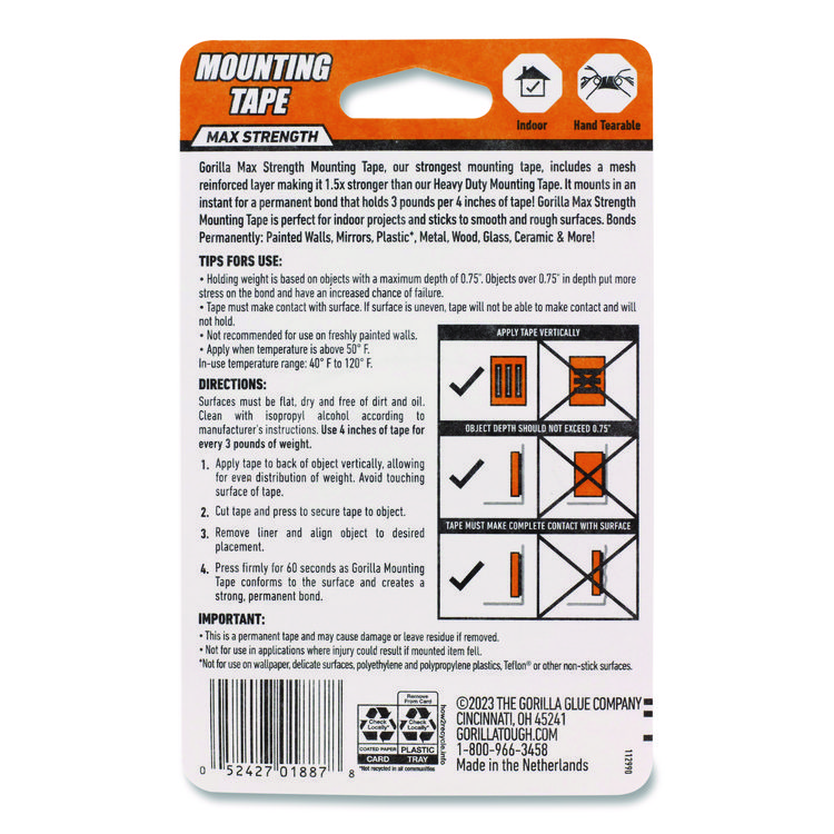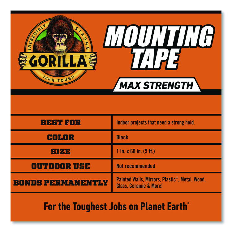 Gorilla Max Strength Mounting Tape, Permanent, Holds Up to 45 lb (3 lbs per 4 in), 1 x 60, Black (GOR112962)