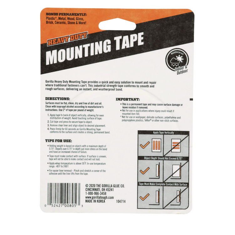 Gorilla Heavy Duty Mounting Tape, Permanent, Holds Up to 60 lb (1 lb per 2 in), 1 x 120, Black (GOR102441)