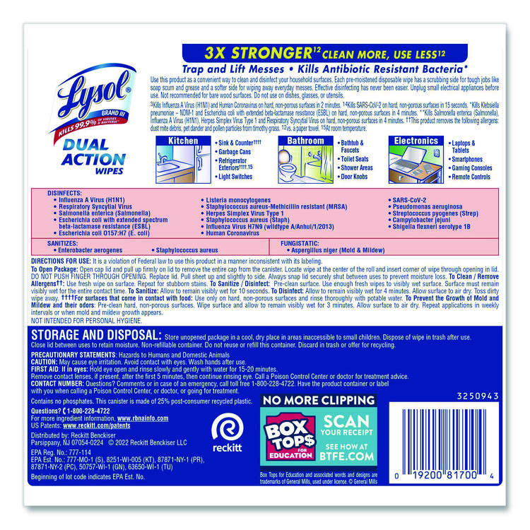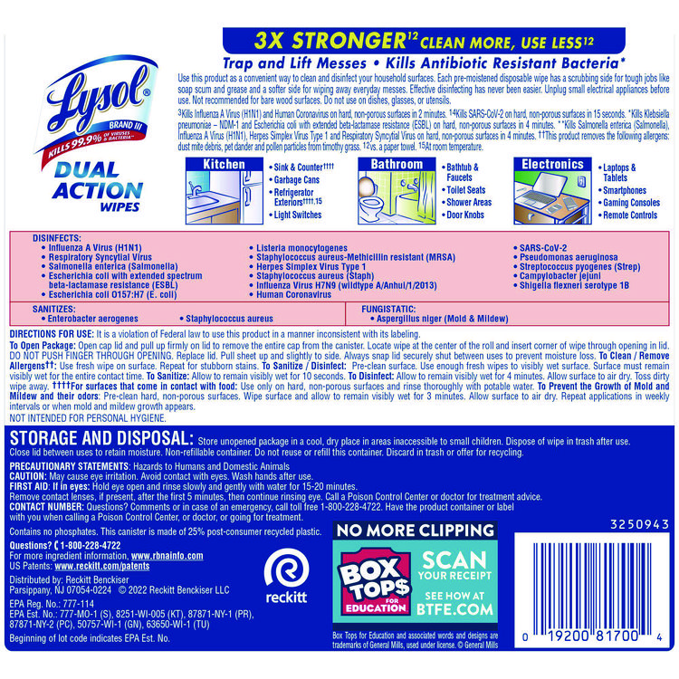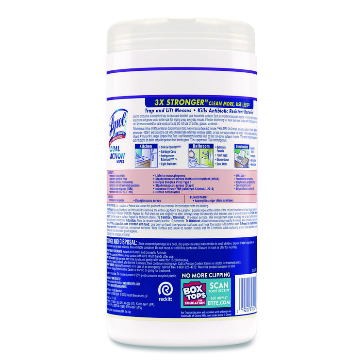 LYSOL Brand Dual Action Disinfecting Wipes, 1-Ply, 7 x 7.5, Citrus, White/Purple, 75/Canister (RAC81700)