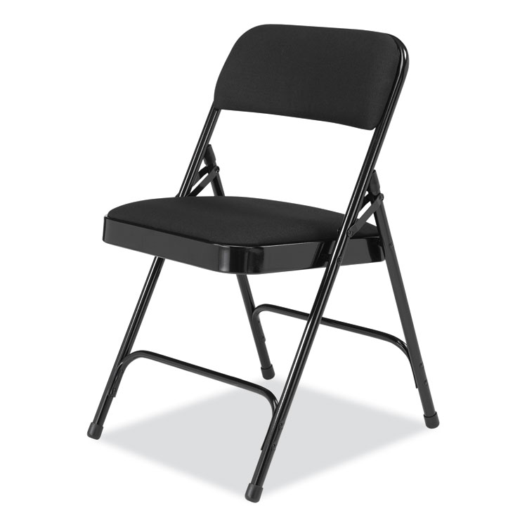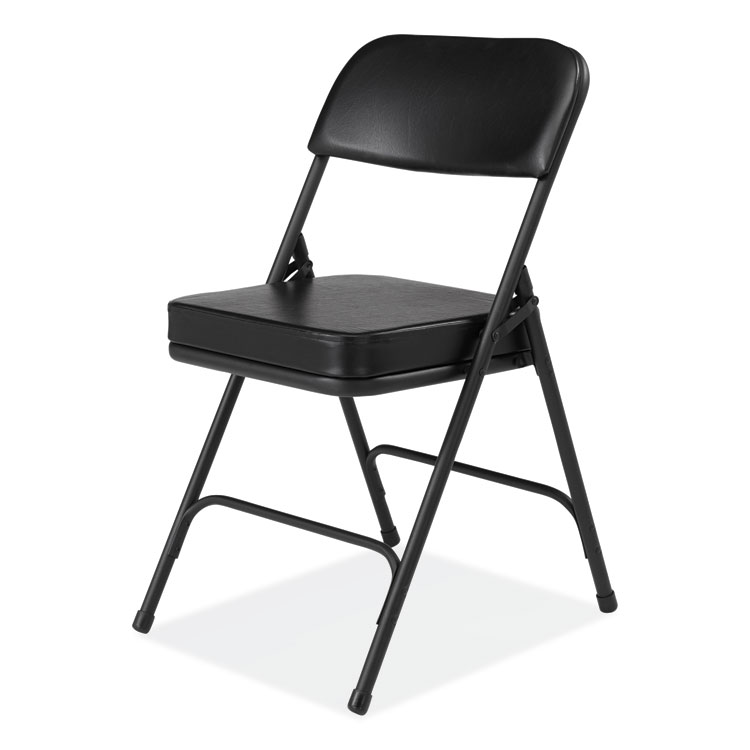 NPS 3200 folding chair is sturdy and easy to fold, thanks to its two-hinge design. It holds up to 300 pounds and has a soft charcoal-gray seat and backrest with thick 2-inch padding for comfort. The black frame is strong, and the chair includes floor protectors to avoid scratches. Perfect for meals, meetings, lounging, or events, these chairs fold flat and come in two per box.