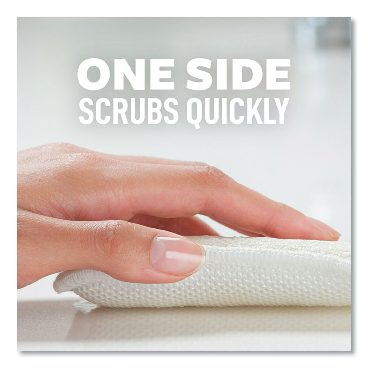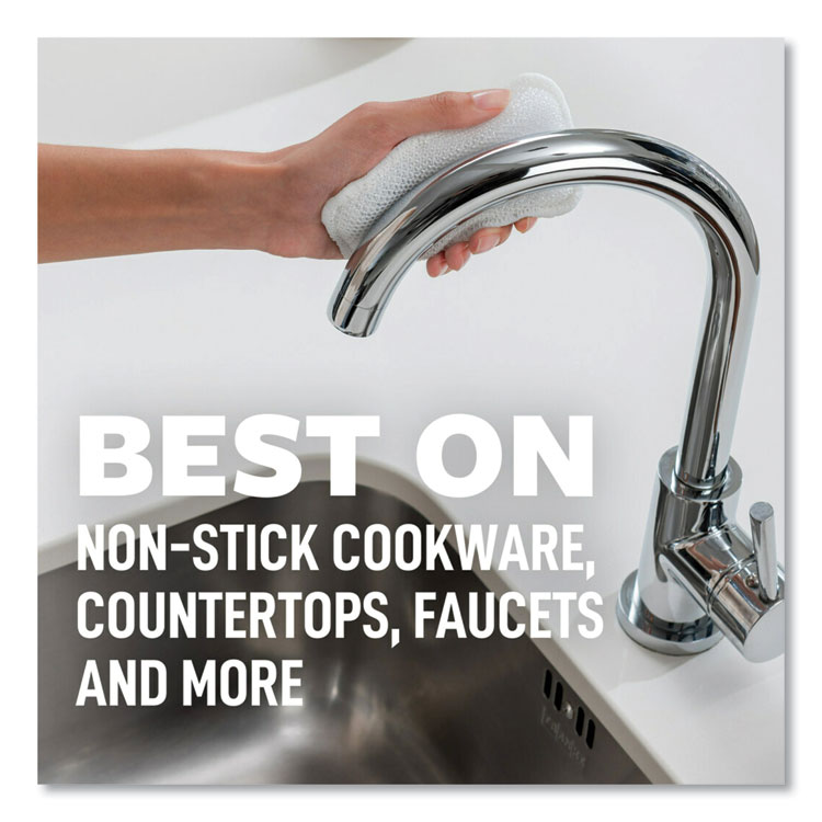 Scotch-Brite Greener Clean Scrub Sponge is made from plants and is safe for cleaning without scratching. It lasts a long time, longer than 30 rolls of paper towels, and can be washed in the dishwasher. The scrub part is with agave plant fibers. Each pack has 6 round sponges, each 2.6 inches wide.
