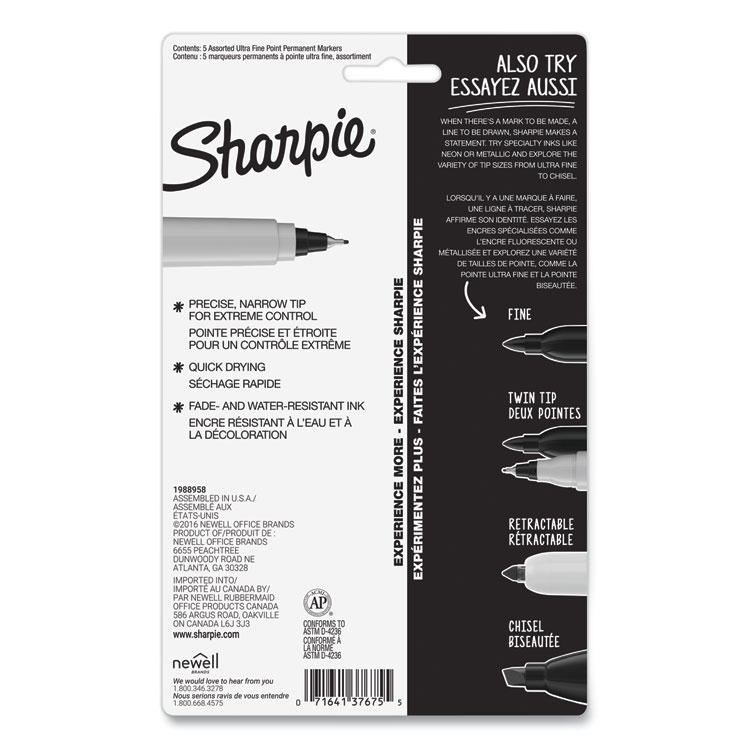 Sharpie Ultra Fine Tip Permanent Marker, Ultra-Fine Needle Tip, Assorted Colors, 5/Set (SAN37675PP)