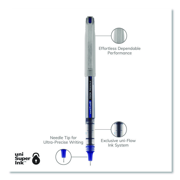 uniball VISION Needle Rollerball Pen, Stick, Fine 0.7 mm, Blue Ink, Gray/Clear/Blue Barrel, Dozen (UBC1734904)