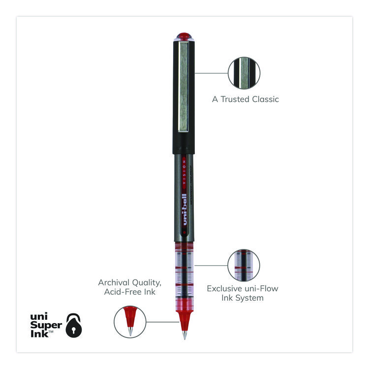 uniball VISION Rollerball Pen, Stick, Extra-Fine 0.5 mm, Red Ink, Gray/Red/Clear Barrel, Dozen (UBC60117)