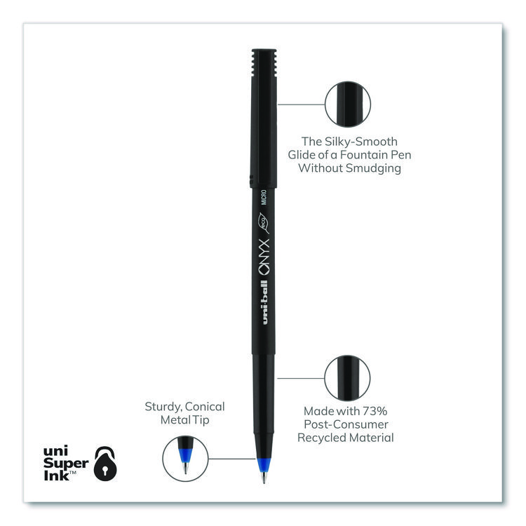 uniball ONYX Rollerball Pen, Stick, Extra-Fine 0.5 mm, Blue Ink, Black/Blue Barrel, Dozen (UBC60041)
