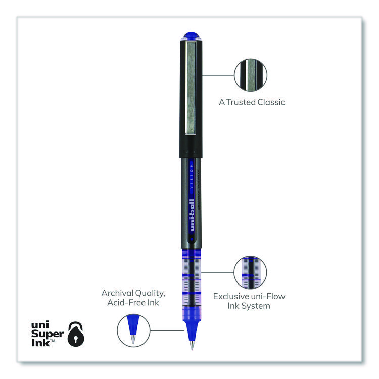 uniball VISION Rollerball Pen, Stick, Extra-Fine 0.5 mm, Blue Ink, Gray/Blue/Clear Barrel, Dozen (UBC60108)