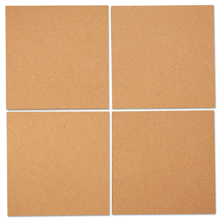 Universal cork tiles are 12 inches by 12 inches and 3/8 inches thick, perfect for creating a bulletin board or covering a wall. The dark brown surface looks natural and works well with push pins. They reduce noise and can also be used as drawer liners, coasters, or to protect surfaces from spills. This pack includes four tiles.
