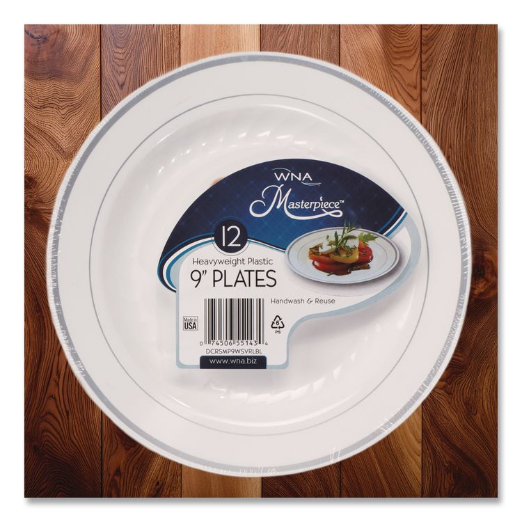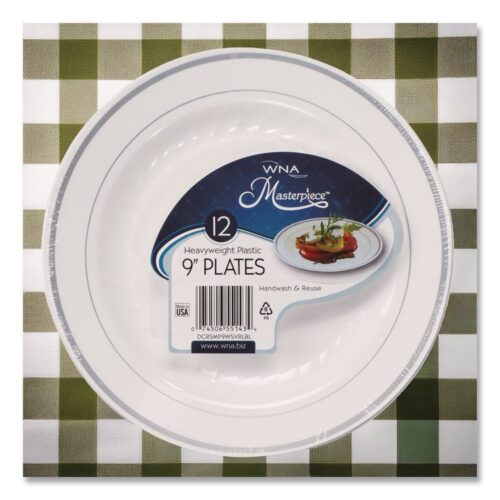 WNA Masterpiece Plastic Plates, 9″ dia, White/Silver, 10/Pack, 12 Packs/Carton (WNARSM91210WS)