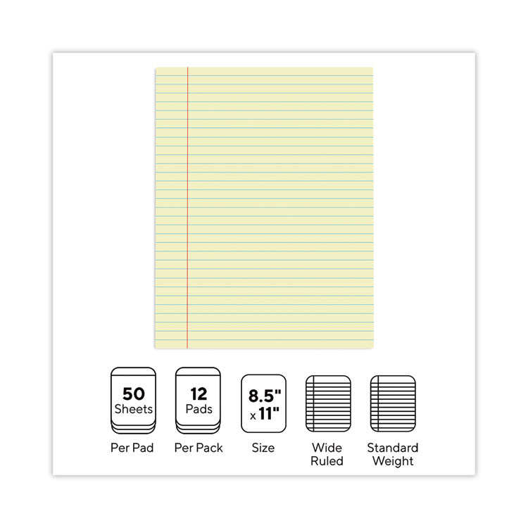 Universal Glue Top Pads, Wide/Legal Rule, 50 Canary-Yellow 8.5 x 11 Sheets, Dozen (UNV22000)