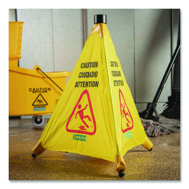 Rubbermaid Commercial Multilingual Pop-Up Safety Cone, 3-Sided, Fabric, 21 x 21 x 20, Yellow (RCP9S00YEL)