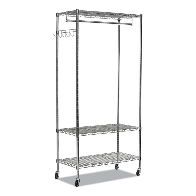 - Time-saving design assembles in minutes without tools. Strong welded wire construction that allows air circulation and helps reduce dust buildup. Double-sided for quick access to items. Rack features hanging rod for garments, five support hooks for umbrellas, bags, and other items to accommodate your needs. Three shelves adjust in 1″ increments and support 350 lbs. on each shelf. Four casters for quick mobility and two lock when it has reached your destination. Total unit capacity is 500 lbs. if used with casters. Hangers not included.