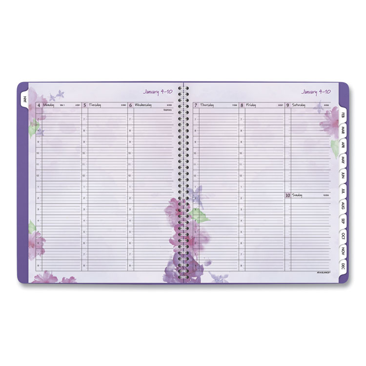 - Keep your plans organized behind lavender, soft touch covers. Interior pages feature a watercolor floral design and each quarter of the year is designated by one of four colors. One week per two page spread with ruled planning space lists hourly appointment times from 8:00 a.m. to 5:00 p.m. each weekday. Weekends are condensed and untimed.