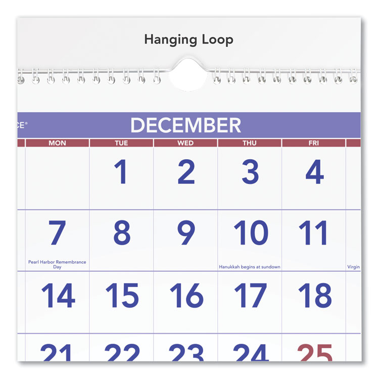 - Three-month per page view: past, current and future months. Large, easy-to-read numbers. Federal holidays highlighted. White wirebound with hanging loop.