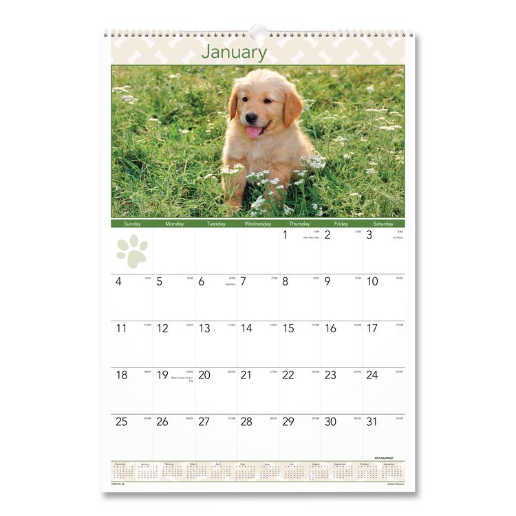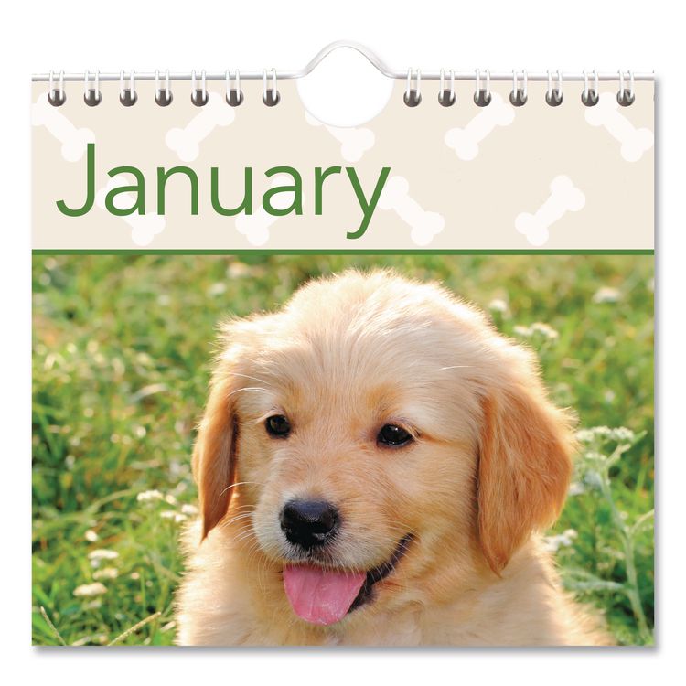 - Smile with a different adorable puppy each month. One month per page. Full-year calendar reference; federal holidays highlighted. Bonus page: current year reference calendar; chipboard backing; wirebound with hanging loop.