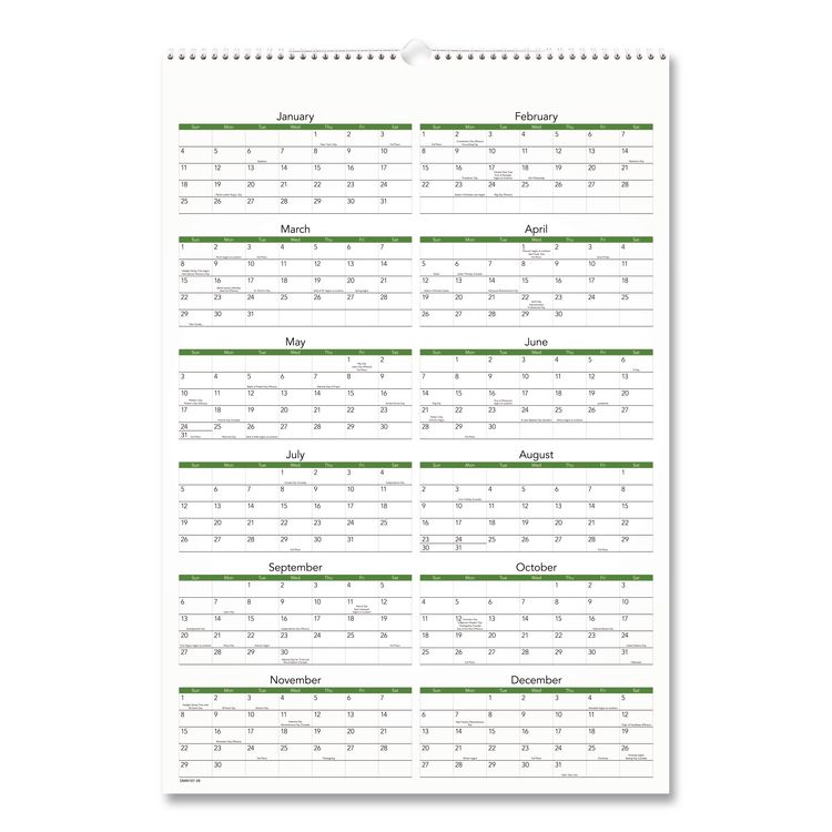 - Bonus page: Current year reference calendar; chipboard backing; white wirebound with hanging loop.