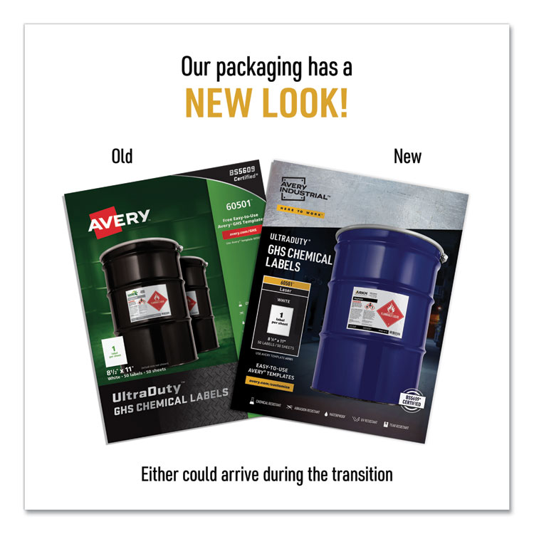 Avery UltraDuty GHS Chemical Waterproof and UV Resistant Labels, 8.5 x 11, White, 50/Box (AVE60501)