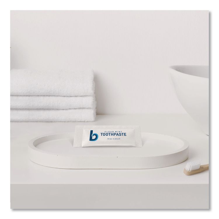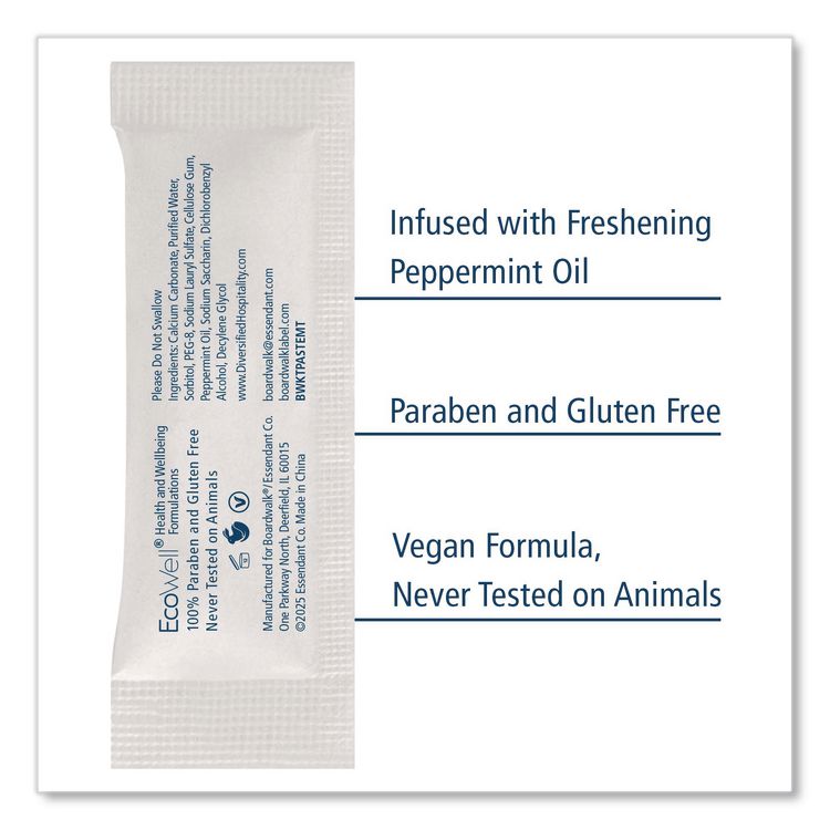 - Protect smiles naturally with Boardwalk® Toothpaste, a formula that’s gentle yet effective. Guests will experience a cleaner, fresher mouth with this fluoride-free toothpaste sachet packet. It is gentle enough for sensitive users, kids and anyone living a more natural lifestyle. Our non-abrasive whitening agents help remove surface stains to brighten smiles without harsh chemicals or gritty textures. Guests will enjoy a cool, minty finish that refreshes their breath without the lingering aftertaste of traditional toothpastes. Each single-use sachet is pre-portioned for mess-free convenience that is TSA-friendly, kid-approved and Mom-trusted. Ideal for hotels, health clubs, dental offices, hospitals, events, giveaways and hygiene or welcome kits. These compact sachets are space-saving, cutting down on bulky tubes and unnecessary waste. Boardwalk® Toothpaste is an EcoWell® Health and Wellbeing group product: 100% paraben and gluten-free, vegan, and 100% cruelty free; never tested on animals.