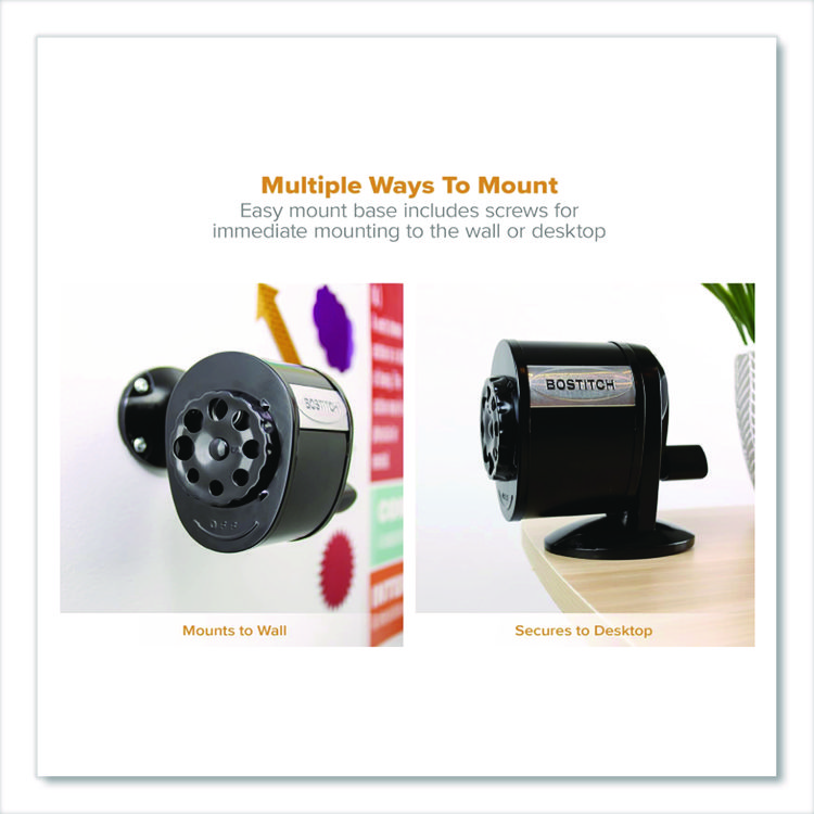 - This Bostitch manual pencil sharpener is a fresh take on a classic! Each unit features an oversized crank knob making it easy for kids to grip and use. What makes this sharpener really special is its replaceable cutter. If the cutter ever becomes dull, just swap it out! Don’t throw out the whole unit. We’re all about saving time and money. Plus, our HHC2â„¢ dual cutter technology extends the life of cutter by 6x. Tip Saver Technologyâ„¢ shapes the perfect pencil tip and prevents over sharpening. This manual pencil sharpener has a high-capacity shavings tray to hold a high volume of pencil shavings. Remove it easily for quick cleaning. The easy rotate selector dial fits eight pencil sizes, making this mechanical pencil sharpener great for schools. With a durable all-metal construction and die cast base, this sharpener is built to last. The hand crank sharpener can be wall mounted using included screws or attached to a tabletop. Try out the Bostitch Manual Pencil Sharpener – the perfect sharpener for any setting!