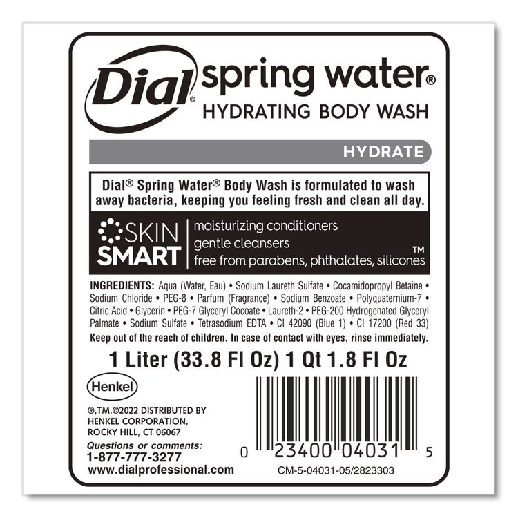 Dial Professional Body Wash Refill for 1 L Liquid Dispenser, Spring Water Scent, 1 L, 8/Carton (DIA04031)
