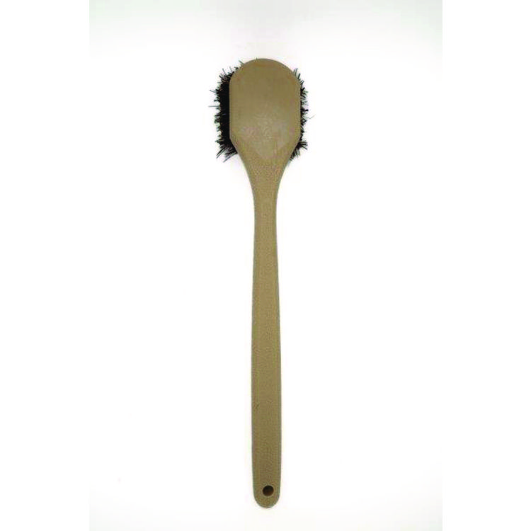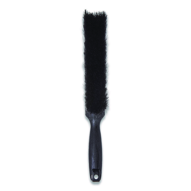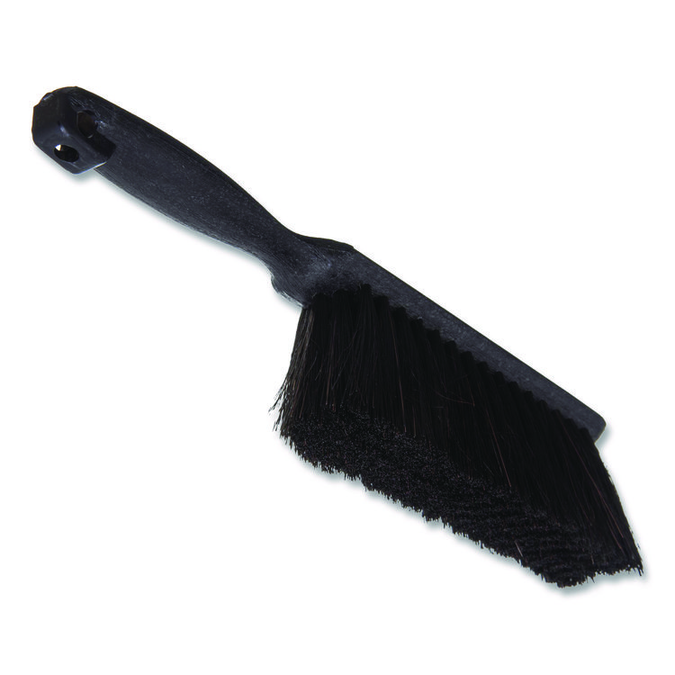 - Convenient split shape allows for dual positioning, letting you scrub baseboards and floors with one stroke. Curved head works to effectively scrub corners. Heavy-duty hygienic non-absorbent beige plastic block will not crack, warp, or mildew. Washable red polypro bristles prevent the spread of germs. Flared ends allow for easy scrubbing. Molded-in squeegee for water control. Long, metal threaded handle makes cleaning easy and swivel hang cap makes storage a snap.