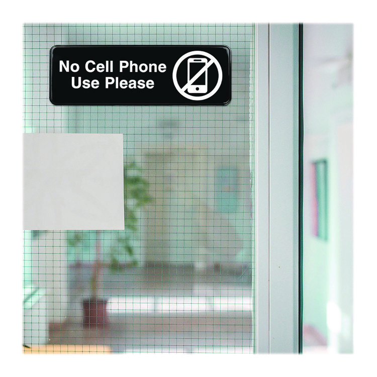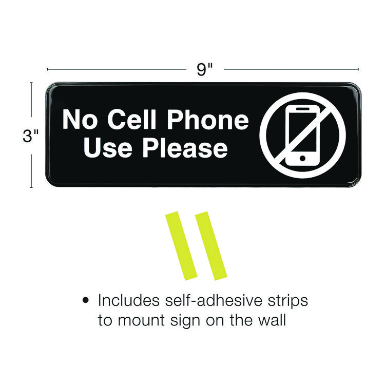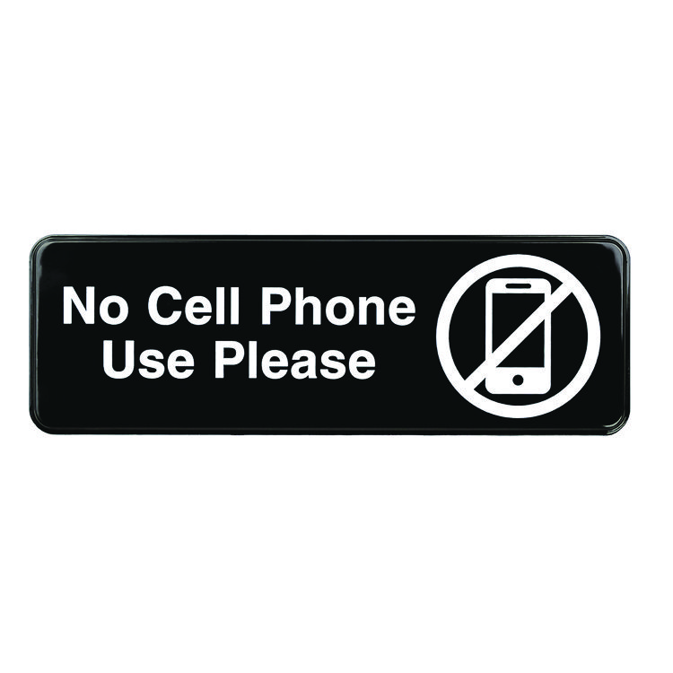 - No Cell Phone Use Please sign is a needed sign for business establishments to remind employees, customers, visitors and pedestrians that may not be aware of hazards or movement nearby to stay off of their cell phones. It is easy to install with the included adhesive strips. For commercial use. Plastic material is durable, withstands most environments and will not fade in extreme temperatures.