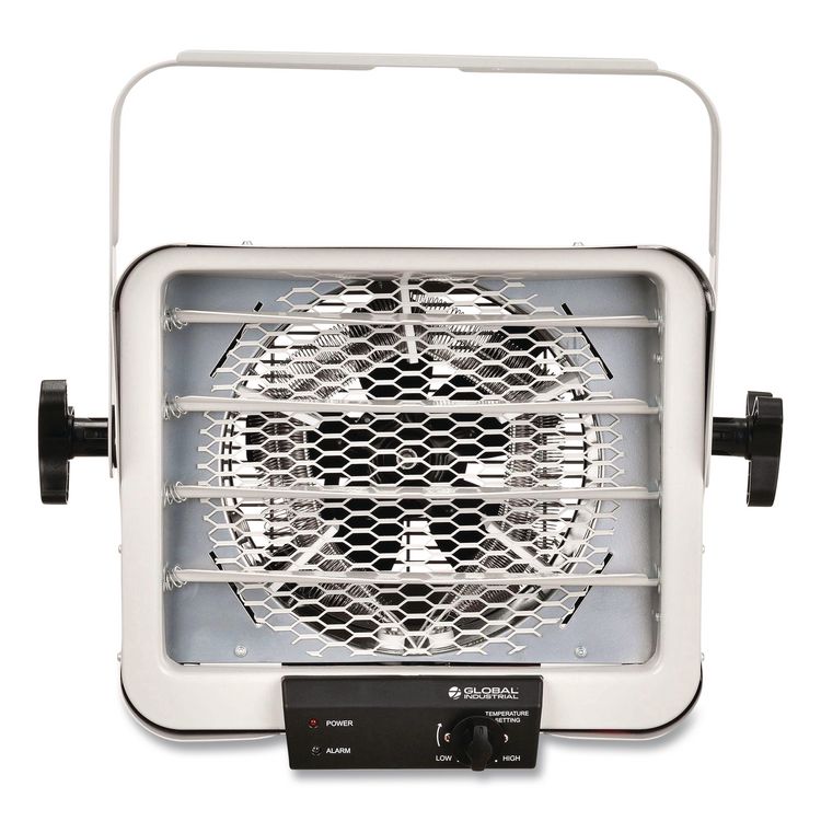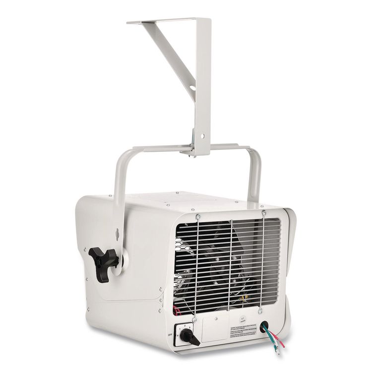 - Great addition as a supplementary or primary heat source, this heater can be mounted on a wall or ceiling using the mounting bracket provided to quickly heat enclosed spaces without taking up any floor space. Unit heater can be tilted vertically. The list of ideal spaces includes garages, stores, maintenance rooms, basements, public buildings, factories, service stations, stairwells, power stations, mechanical rooms, stock rooms and workshops. This forced air unit heater uses a fan to push air over heating elements to quickly create hot air that is evenly distributed into a room to reach desired temperature levels. In addition, louvers adjust up and down for even greater control of throw direction. The unit is easily turned on with a push of a button. Easy to use built-in turn dial thermostat goes from Off position all the way up to Max and can be set at desired comfort level. It is constructed from cold rolled steel for extra toughness and durability. The unit comes equipped with thermal cut-off protection, a safety feature that will automatically turn the heater off if overheating occurs. This heater is a dual-phase unit shipped from the factory wired for single-phase and can be converted easily into three-phase operation. Easy to install and quick access to control box and wiring makes it easy to service.