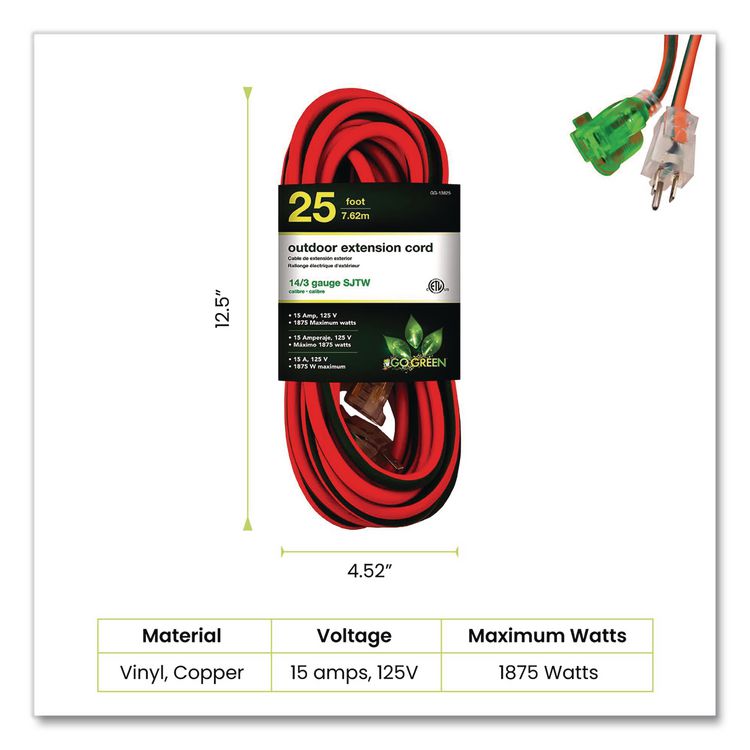 - GoGreen Power two-prong extension cord comes equipped with three outlets and is rated for indoor use only. Each extension cord is fixed with a child safety cover for extra protection. The 16 gauge kink-free cord is safe and reliable, providing superb insulation. It can be plugged into a standard three-prong 120 V AC outlet. The heavy-duty molded plugs ensure a snug and secure fit and avoid detachment from the wire. Perfect for daily use, this 16/2 SPT-2 cord is cETL certified and meets all industry standards. The indoor extension cord is rated for a maximum of 13 A, 1,625 W, 125 V. Perfect for devices such as lamps, phone chargers, fans, heaters and many other electronics. We offer free recycling and free shipping back of the used product to our recycling facility. Please view the recycling code and instructions on the back of the package and visit the GoGreen Power website for additional information.