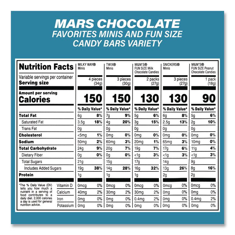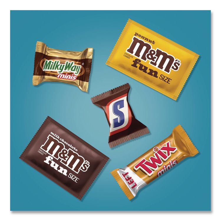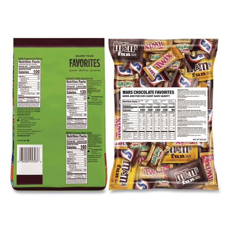 - This two bag pack includes a Party Pack Stand Up Bag Milk Chocolate Assortment of Reese’s, Almond Joy, Kit Kat and York Peppermint Patties and MARS Chocolate Favorites Assorted Variety of mini Milky Way, Snickers, TWIX and fun size M&Ms and Peanut M&Ms. They offer the perfect variety to satisfy your sweet tooth. Whether you’re in the mood for minty dark chocolate, crispy milk chocolate wafers, caramel, nougat, peanut butter or just pure chocolate, this variety pack has something for everyone. Bring these chocolate favorites to your next party, fill up the candy dish, stash it in your desk drawer or pack in the kids’ lunches for a surprise they’ll love!