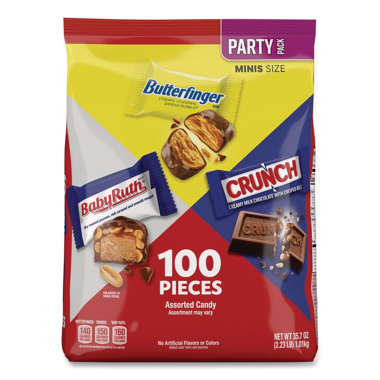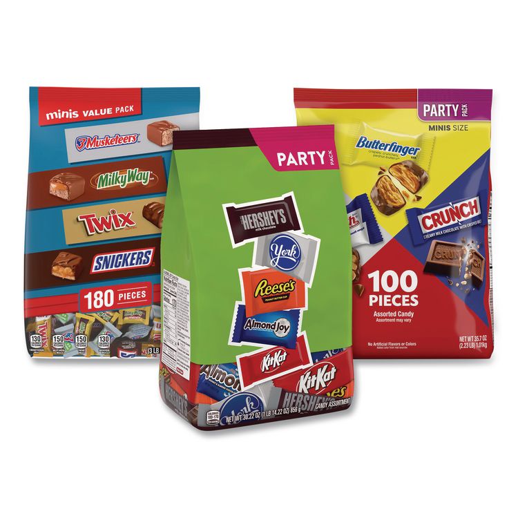 - Enjoy a delicious milk chocolate treat anywhere and anytime with this value pack of Hershey, Mars and Nestle assorted candy! Offering twelve different miniature crowd-pleasing favorites, this candy assortment is perfect for sharing with family, friends, teammates or co-workers. Take this chocolate favorites bundle into the office break room, pour some individually wrapped candies into your jar at home or take a bag to your next sports game to celebrate the win. This assortment includes Kit Kat, Reese’s peanut butter cups, Hershey’s milk chocolate candy bars, York peppermint patties, Almond Joy, Butterfinger, Nestle Crunch, Baby Ruth, 3 Musketeers, Milky Way, Twix and Snickers. Perfect for parties, sidelines, holidays and fundraisers!