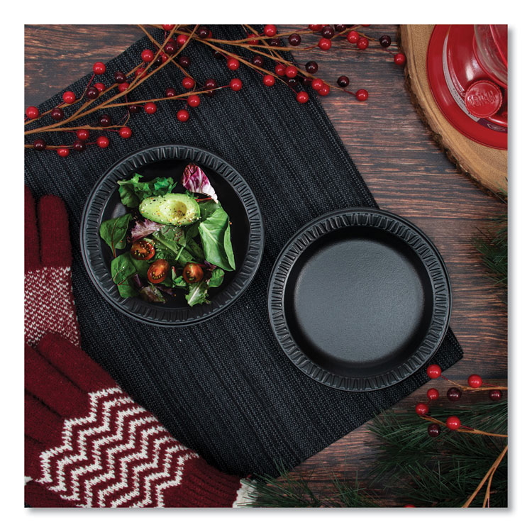 - Premium line high impact polystyrene tableware. Offers exceptional strength and performance with a high end appearance. Smooth rigid plastic with an attractive, china-like luster. Superior cut resistance. Unique upscale pattern rim de-nesting feature allows for easy separation one at a time.