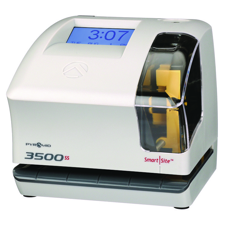 - Do more with the Pyramid Time Systems model 3500ss multi-purpose time clock and document stamp. Perfect for the busy small business the 3500ss is a punch clock plus document stamp all-in-one. Record employee time and attendance by tracking job costs plus stamping documents. Track employees start times, break times, lunch times and finish times on a weekly timecard, or select from 14 pre-programmed message options to stamp invoices, attendance logs, legal paperwork or other time-sensitive documents. The side-loading timecard and document feed accommodates left- or right-hand orientation. An alignment guide helps line up punches. Prints the date and time (AM/PM or military time format) on weekly employee timecard. Internal battery backup safeguards data and settings up to seven days without power. Automatic reset for short months, leap year and daylight saving time.