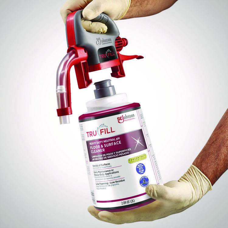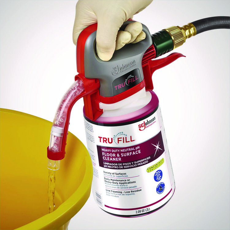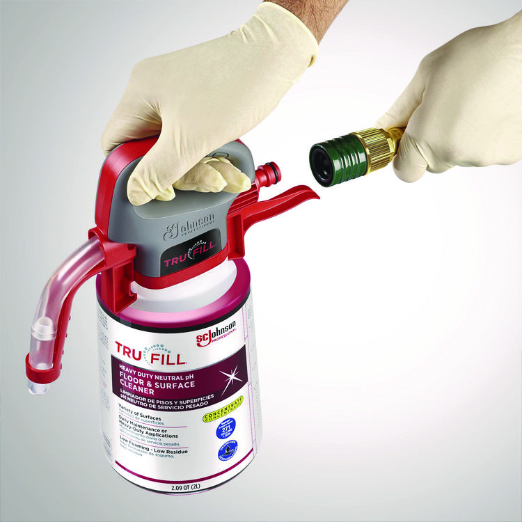 - Take dilution control off the wall with the TruFill Dispensing System. TruFill offers easy-to-use, quick-change cartridges that automatically blend concentrates with water to provide worry-free dilution. The rugged design easily attaches to buckets and auto scrubbers for simplified dilution mixing into these high-volume vessels. The TruFill hose (sold separately) attaches easily to the dispenser with a quick-connect adapter (sold separately), and the twist-lock design securely attaches the dispenser head to the no-spill 2 L concentrate cartridge, creating a system that delivers up diluted solution.