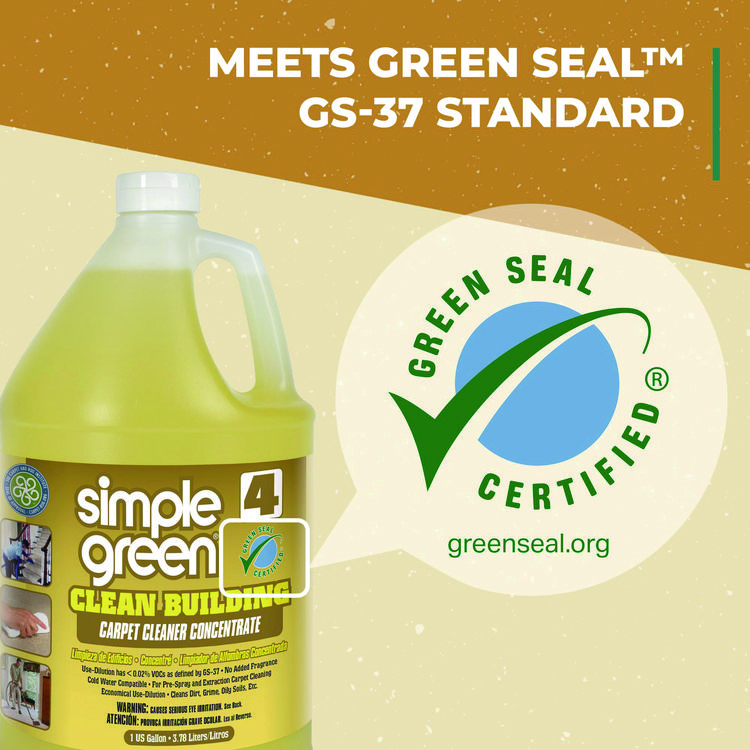 - Simple Green Clean Building Carpet Cleaner removes dirt and stains from carpet, rugs and upholstery. Will not damage carpet fibers, degrade carpet backings or leave residue behind. Certified by the Carpet and Rug Institute as being safe for use on carpets in pre-spray and extraction cleaning. The concentrated formula dilutes at 1:21 for great value. Complies with LEED green building requirements and most environmentally preferable product purchasing programs in place throughout government. Ideal for industrial and institutional use, especially in high traffic areas.