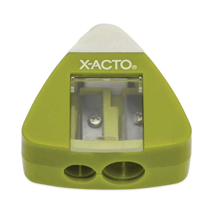 - Conveniently sharpen your pencils and erase mistakes with the X-ACTO triangle manual pencil sharpener. With a built-in eraser, you’ll be able to switch from sharpening to correcting in no time. The small, handheld pencil sharpener sharpens two different pencil sizes, while its portable and lightweight size makes it easy to carry in backpacks or tuck into desk drawers.